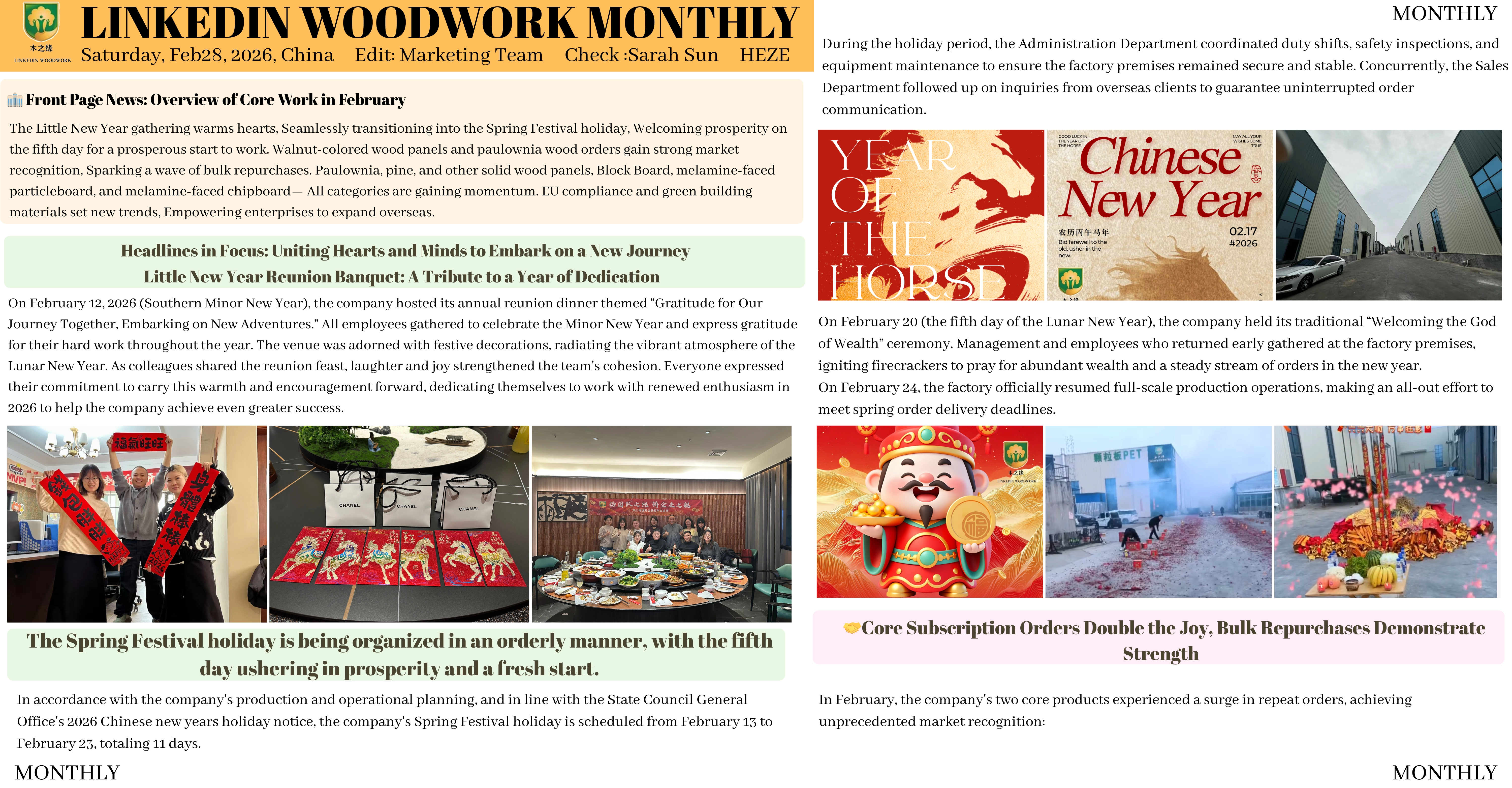 Le mois a commencé avec le petit banquet annuel du Nouvel An « Gratitude pour notre voyage ensemble », réunissant l'équipe dans une célébration et réaffirmant les objectifs communs. Après les vacances, l'usine a repris ses activités le 24 février, en donnant la priorité au respect des délais de commande du printemps. Les principaux faits saillants comprenaient :