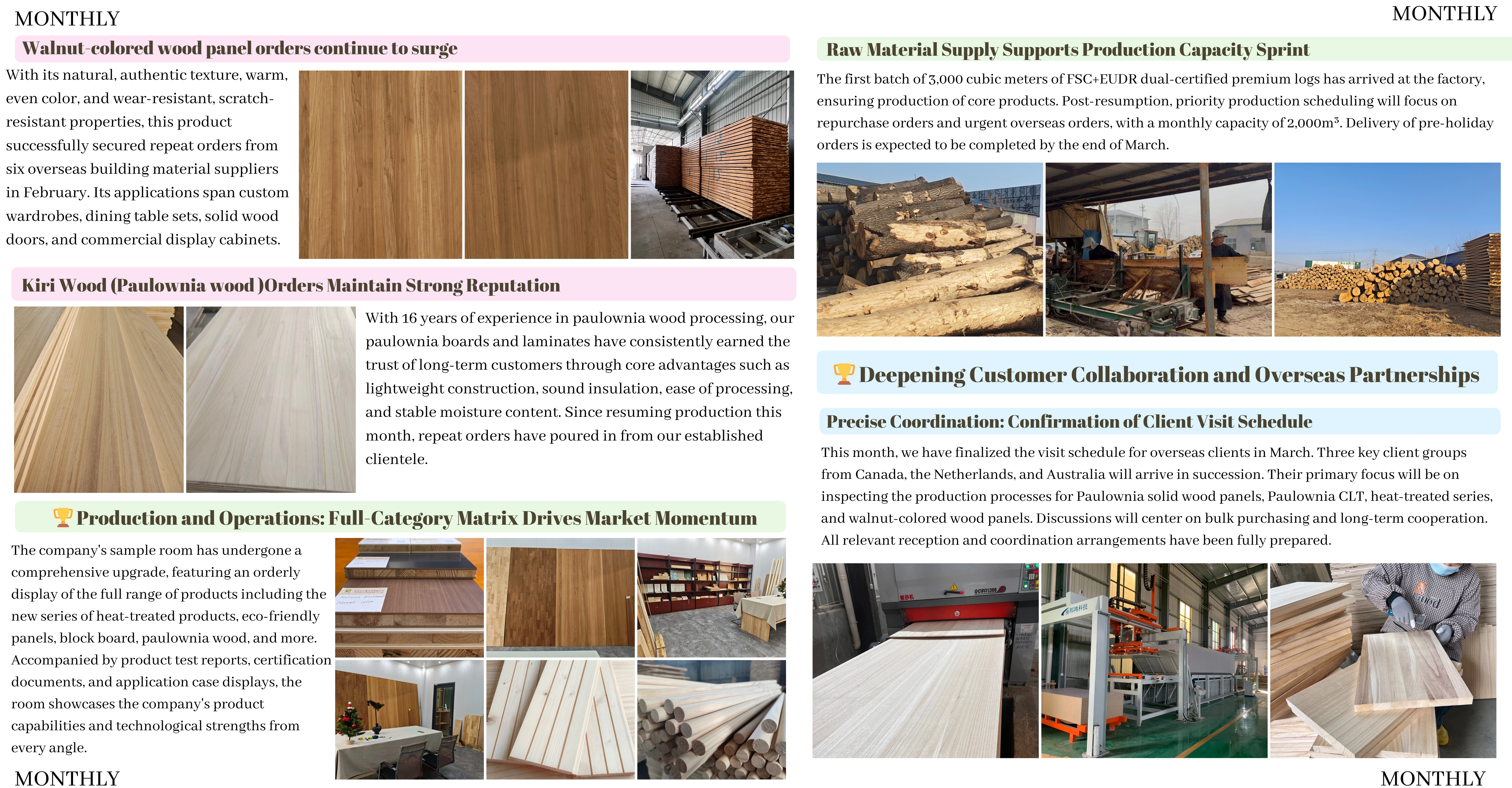 - Partenariats mondiaux : Visites confirmées de clients du Canada, des Pays-Bas et d'Australie en mars, axées sur les achats en gros et la coopération à long terme pour les panneaux en bois massif de Paulownia, les séries traitées thermiquement et les panneaux de couleur noyer.