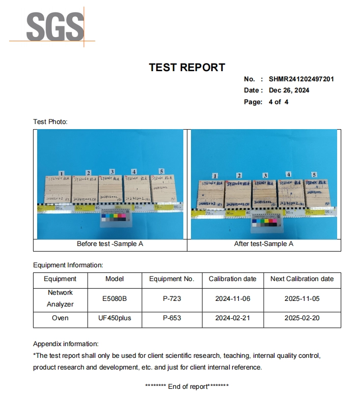 Les résultats des tests (rapport SGS n° SHMR241202497201) ont confirmé l'absence de fissures ou de délaminage dans nos panneaux de bois après une exposition à l'eau bouillante et un vieillissement au four. Cela prouve que notre système adhésif est entièrement conforme à la norme D4, validant sa durabilité et sa résistance à l’eau exceptionnelles pour les applications extérieures et à forte humidité.