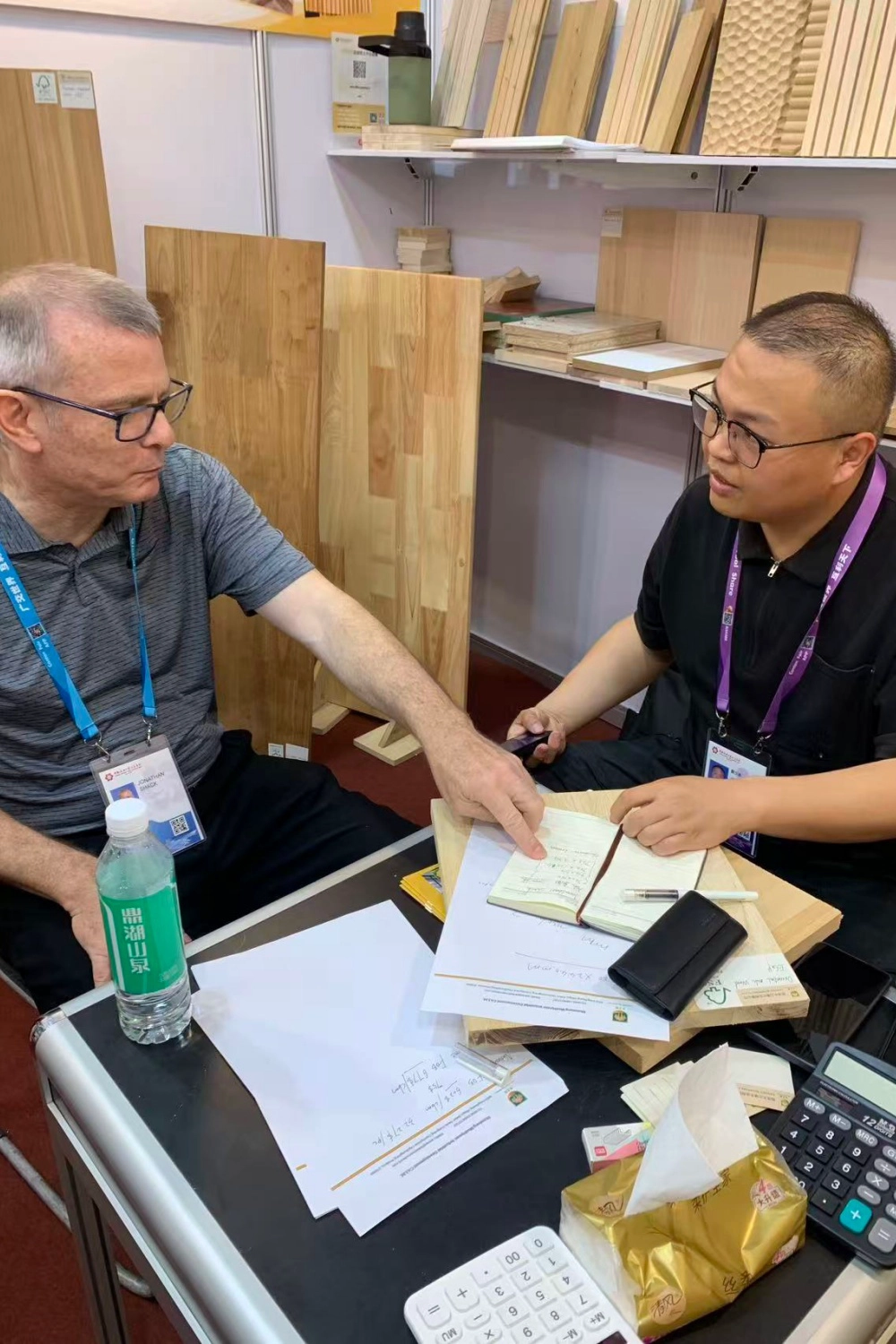 Gedurende de hele beurs bleven onze verkoopmedewerkers op hun post en namen het initiatief om bezoekers te helpen, waarbij ze geduldig de productkenmerken, milieuvoordelen, productieprocessen en details van de naleving van de EU CE-certificering voor onze massief houten panelen uitlegden. Ze gaven gedetailleerde antwoorden op verschillende vragen van bezoekers over productkwaliteit, doorlooptijden, op maat gemaakte diensten en exportprocedures. Ze stemden oplossingen af op de specifieke behoeften van bezoekers uit verschillende regio's en boden gepersonaliseerde, één-op-één ondersteuning gedurende het hele proces, waarmee ze de servicefilosofie en het bedrijfsethos van het bedrijf demonstreerden door hun professionaliteit en attente service.